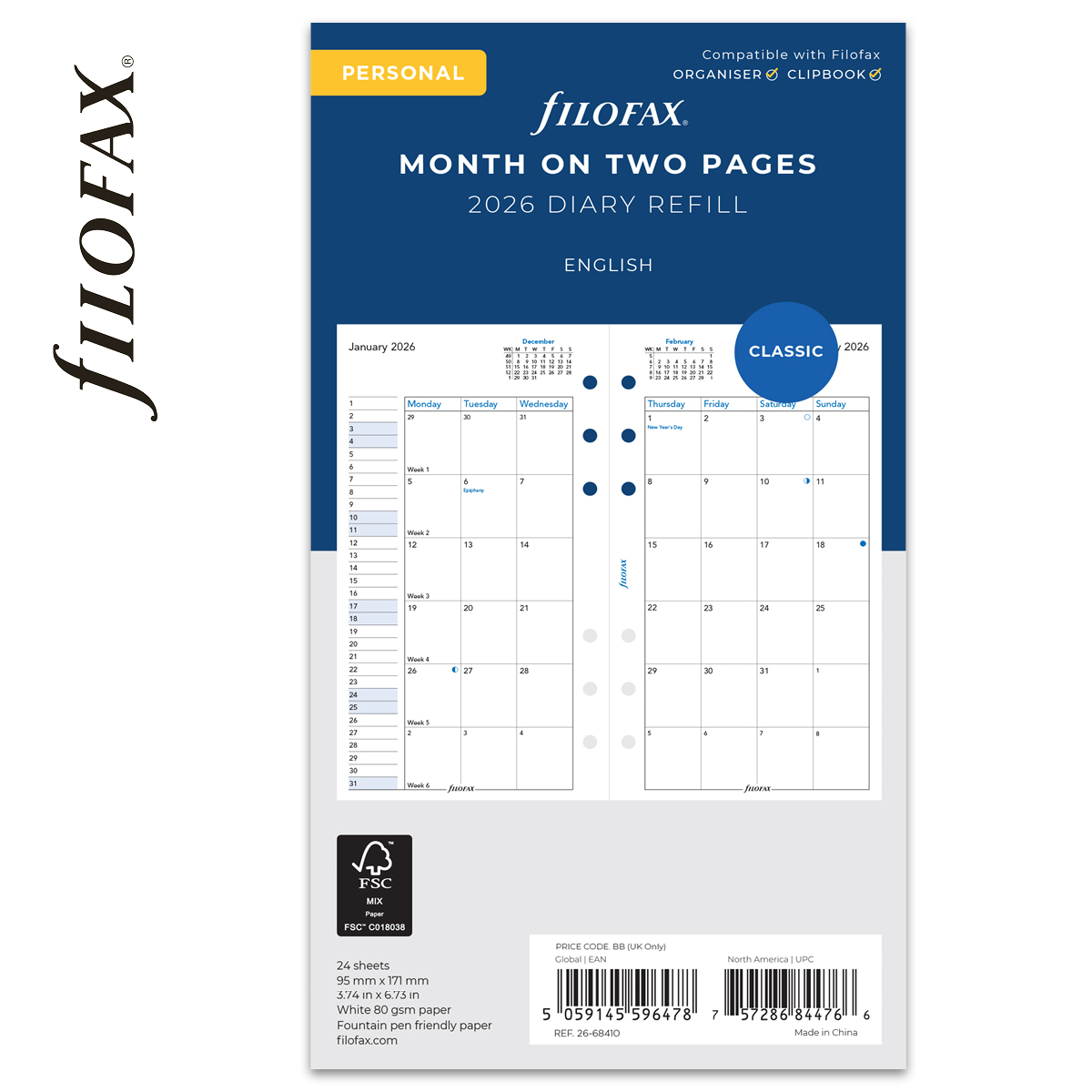 Filofax Naptárbetét Havi Personal Fehér 2026