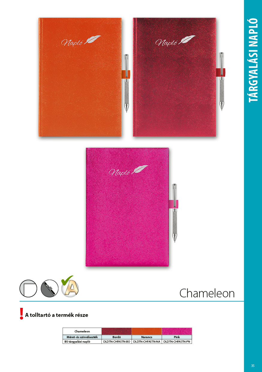 Tolltartóval és gyönyörűen csillogó, a fényviszonyoktól függően változó színekben tündöklő borítóval készült A5 méretű Chameleon tárgyalási naplók. A termék fehér lapokkal készül.