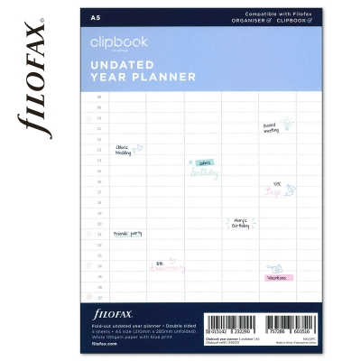 A Filofax dátum nélküli naptárbetétek kiválóan alkalmasak projektek, szabadságok és egyéb folyamatok tervezésére, valamint évfordulók, fontos események nyilvántartására.