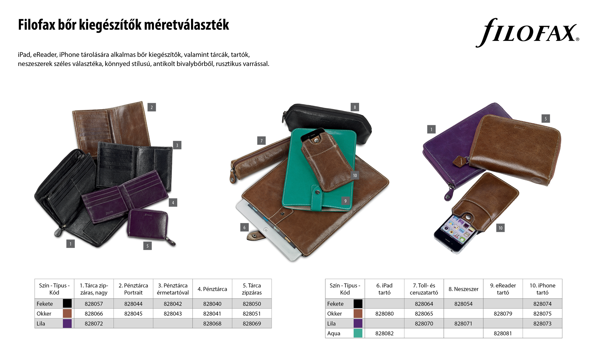 iPad, eReader, iPhone tárolására alkalmas bőr kiegészítők, valamint tárcák, tartók, neszeszerek széles választéka, könnyed stílusú, antikolt bivaly színbőrből, rusztikus varrással. Méret: 80×130×5 mm.