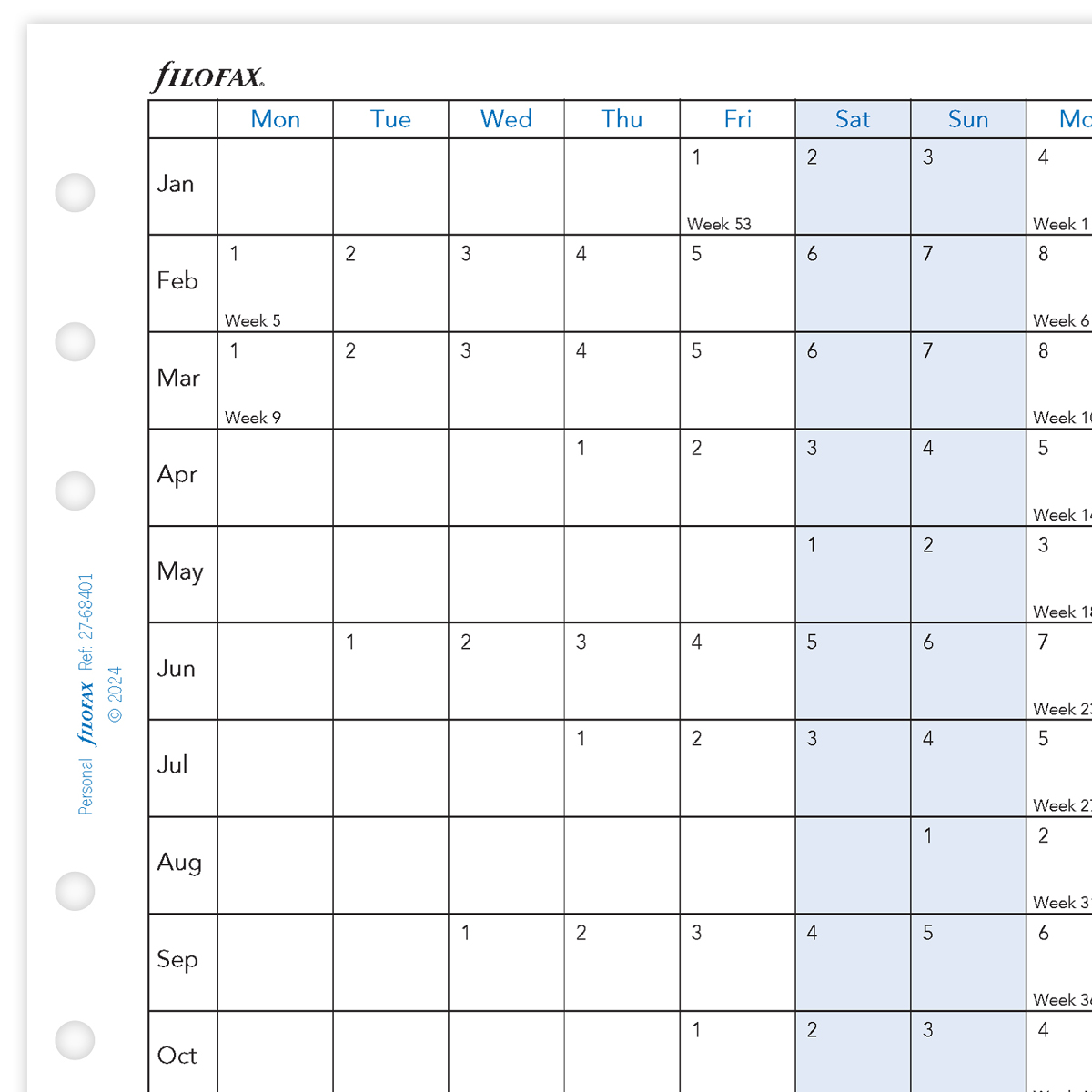 Filofax éves tervező naptárbetétek, horizontális elrendezéssel, kihajtható lapon. 100 g papír. Filofaxokban, Clipbook jegyzetekben és más márkájú gyűrűs kalendáriumokban is használható.