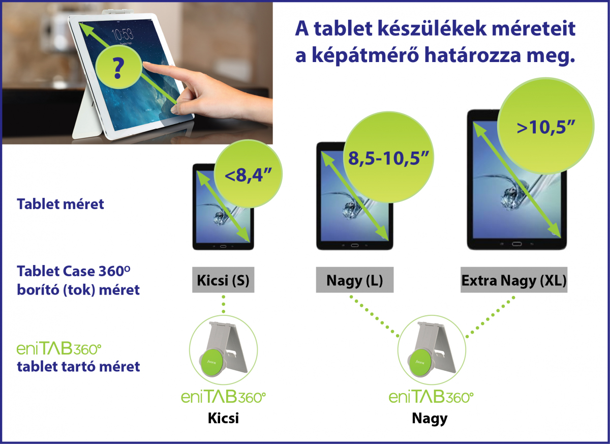 A Filofax eniTAB360 univerzális tablet tok + tartó bármely tablet készülékhez használható. Önnek csak a tablet készülék méretét kell ismernie: