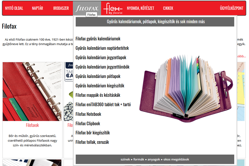 A hatalmas választék jobb áttekintése érdekében, a termékeket kategóriánként csoportosítva tekintheti meg (pl. Filofax, Flex, Naptárak). A menüsoron választhat közülük.