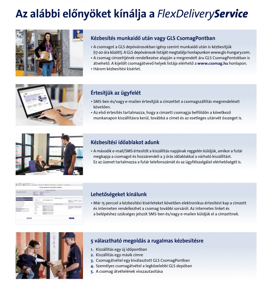 Az Ön jobb kiszolgálása érdekében cégünk díjmentesen biztosítja a Flex Delivery szolgáltatást, mellyel Ön számos, az áru átvételét segítő, rugalmas szolgáltatásra jogosult. Többek között értesítéseket kap a csomag kiszállításával kapcsolatban. Az értesítések e-mail és SMS formában kerülnek kiküldésre. A telefonhívásos értesítés feláras szolgáltatás, melyet a szállítási feltételek megadásakor rendelhet meg.